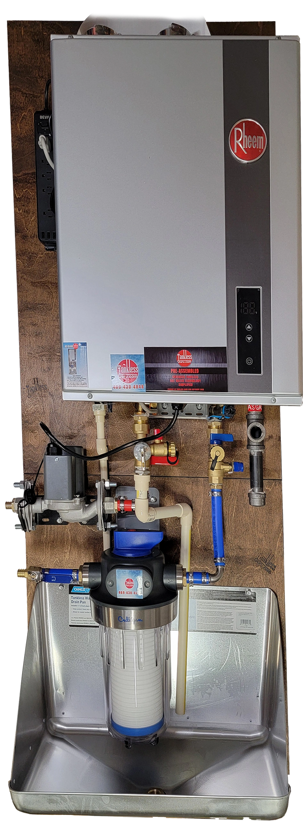 Our exclusive 5-year Parts and Labor Warranty covers only the Rheem/Culligan tankless Pre-Assembly package. This warranty covers all components under normal operating conditions. The Rheem/Culligan tankless package includes the RTGH-95DVLN-3, service valves, pump, pan, piping, PVC venting connection, and valves.